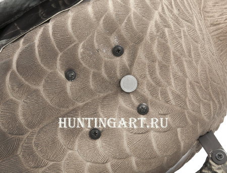 Механическое чучело серого гуся, это активная приманка с машущими крыльями, в кормящейся позе. Имитирует анатомические движения крыльями идентичные живой птице. Чучело легко и быстро устанавливается на стекловолоконную стойку. Управляется приманка с помощью пульта ДУ.