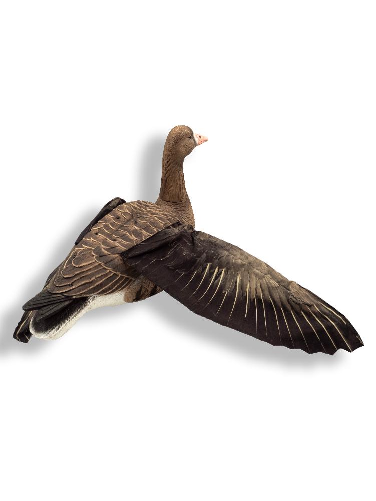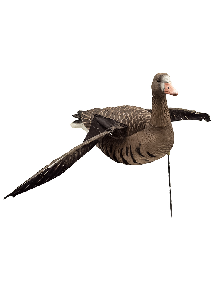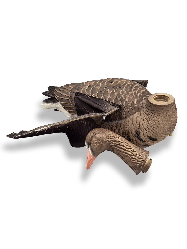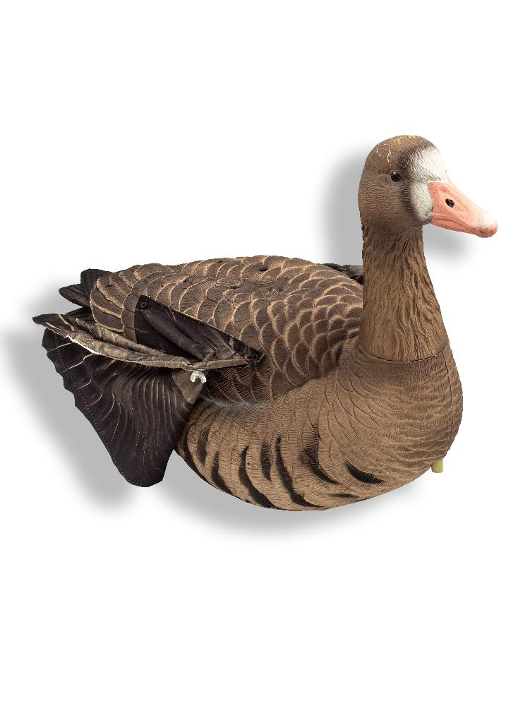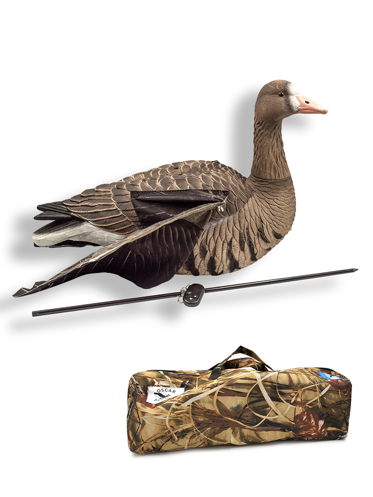 Механическое чучело белолобого гуся - активная приманка, имитирующая живую птицу с анатомически верными движениями крыльев. Чучело устанавливается на стойку, управляется при помощи пульта дистанционного управления.
