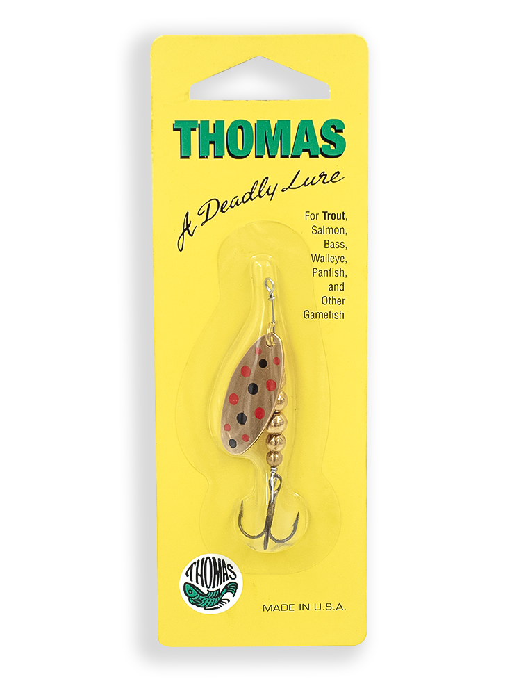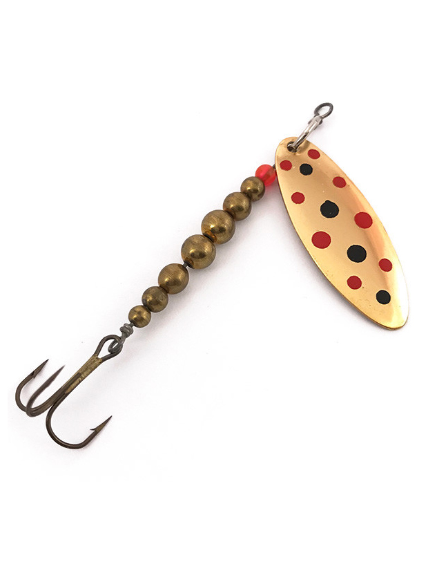 Thomas E.P.Spinn – настоящий убийца для форели и многих других хищных рыб. Высококлассное исполнение лепестка из латуни, скобы лёгкого вращения, цельных латунных шариков (не полых как у дешёвых имитаций) и оси из нержавеющей стали. У этой классической вращающейся блесны лепесток покрыт серебром или золотом с ювелирным качеством. Есть исполнение с черными или красными точками, любо двухцветное без точек.