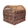 Засидка достаточно большая, в ней свободно могут разместиться 2 охотника в сидячем положении. Конструкция засидки автоматическая, что позволяет, как быстро установить засидку в рабочее положение, так и разобрать ее после окончания охоты. В засидке используются сетчатые смотровые окна на молнии, которые быстро открываются и закрываются. В засидке расположены 6 смотровых окон: 2 сверху, 2 сбоку и 2 с торца. Верх засидки состоит из 2 частей. Одна половина из сетчатого материала (для обзора за небом), которая откидывается в сторону, что позволяет вести прицельную стрельбу по налетевшему гусю или утке. Вторая половина верха из основного материала (не откидывается). Пола у засидки нет. Боковые стенки укрытия изготовлены из прочного не продуваемого материала, что защищает от ветра и дождя. Одна стенка засидки без окон. С трех других сторон засидки имеются окна из сетки в верхней части, закрывающиеся на молнию, что обеспечивает отличный обзор и позволяет производить выстрел не только через верх. Надежный сборный каркас из стеклопластиковых дуг. По всему периметру засидки имеется большое количество пришитых полосок ткани из эластичного материала для крепления пучков травы и веток (дополнительная маскировка местной растительностью). С одной стороны вход, закрывающийся на молнию.