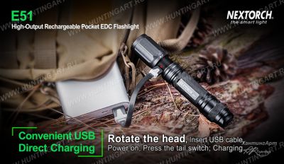Фонарик E51 оснащен встроенным разъемом Micro USB для зарядки. Рядом с разъёмом USB расположен индикатор заряда батареи. При зарядке фонаря горит красным цветом, зеленым – если батарея полностью заряжена.