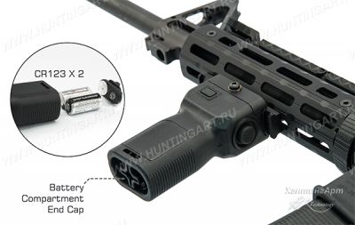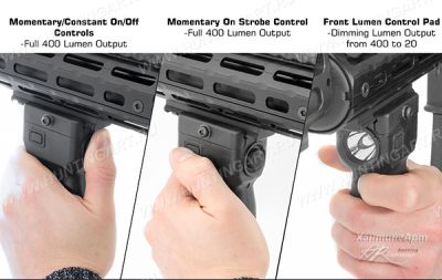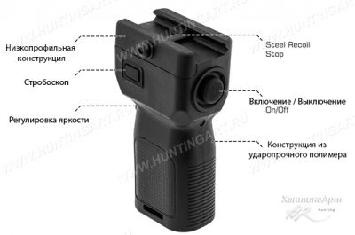 Это компактная подствольная полимерная рукоятка UTG со встроенным светодиодным фонарем Cree LED максимальной мощности 400 люмен и функцией стробоскопа. В качестве оружейного фонаря обеспечивает подсветку цели в условиях малой освещенности. Размещение фонаря на оружии позволяет вести наблюдение в затемненных местах без снижения способности стрелять. В качестве рукояти и позволяет прочно и удобно удерживать оружие, уменьшает усталость, увеличивает точность и удобство стрельбы в различных положениях. Рукоятка изготовлена из ударопрочного полимера черного цвета.