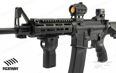 - Закрепляется рукоять на оружии, имеющем планку Picatinny (Пикатини). Основание Picatinny низкопрофильное. Рукоять не быстросъемная.
