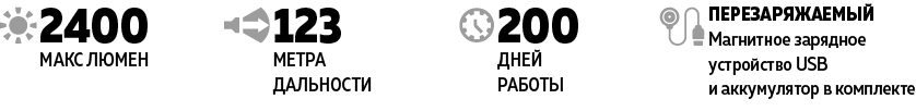 - Pro Мощная электроника обеспечивает впечатляющий световой поток в 2400 люмен и рекордные 6.5 месяцев работы в режиме Светлячок. Постоянная яркость света даже при низких температурах и не полностью заряженном аккумуляторе.