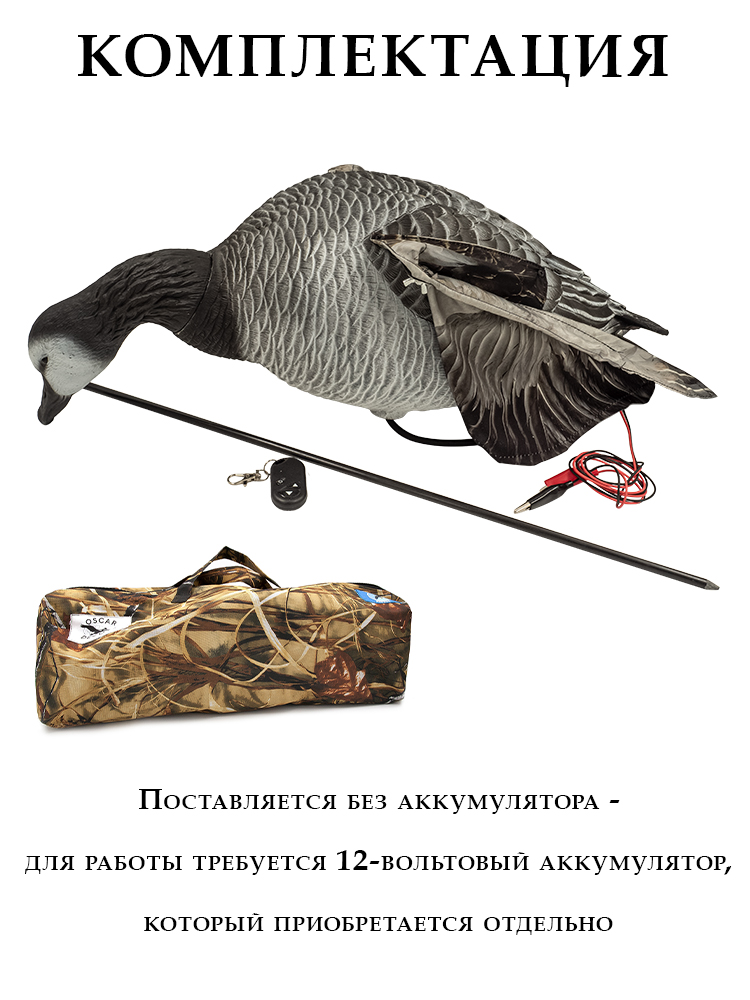 Для работы требуется 12-вольтовый аккумулятор (приобретается отдельно). Чучело отлично подходит для охоты, так как создает реалистичную имитацию живой птицы благодаря точным движениям крыльев и анатомически верной конструкции.