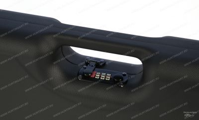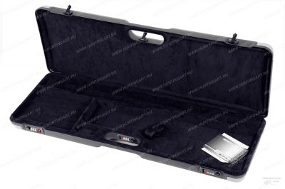 Кейс серии Люкс, изготовлен из рифлёного пластика ABS, чёрного цвета с серыми вставками по углам. Все детали кейса соединены между собой технологией ультразвуковой сварки, что гарантирует прочность и долговечность конструкции. Основные свойства этого материала, повышенная ударопрочность, эластичность, влагостойкость и стойкость к щелочам и моющим средствам. Шарнирные петли изготовлены в едином корпусе с кейсом и соединяются 2 мм шпилькой. Внутренняя обивка кейс с обеих сторон, выполнена из мягкого материала - велюра темно-синего цвета, составляющего основание кейса с которым соединяется вспененный полиэстер (поролон). В нижней половинке кейса имеется специальная термоформа обтянутая тканью, состоящая из 2 основных отделений под ружье и одного под аксессуары. В одном из отделений имеется фиксирующее кольцо для оружия.