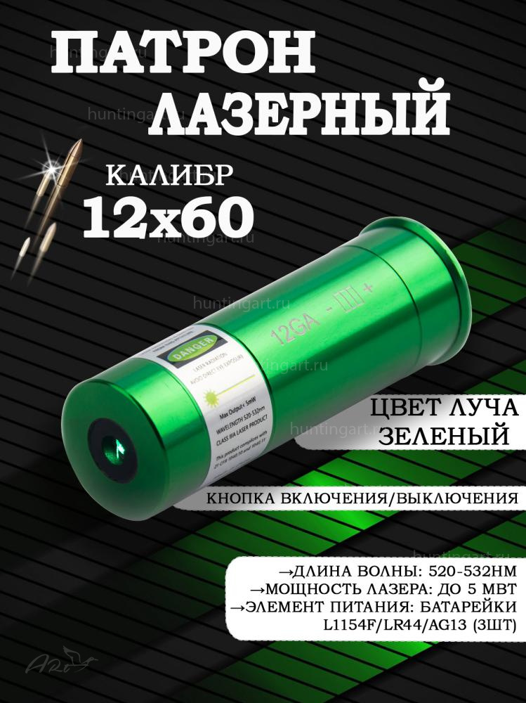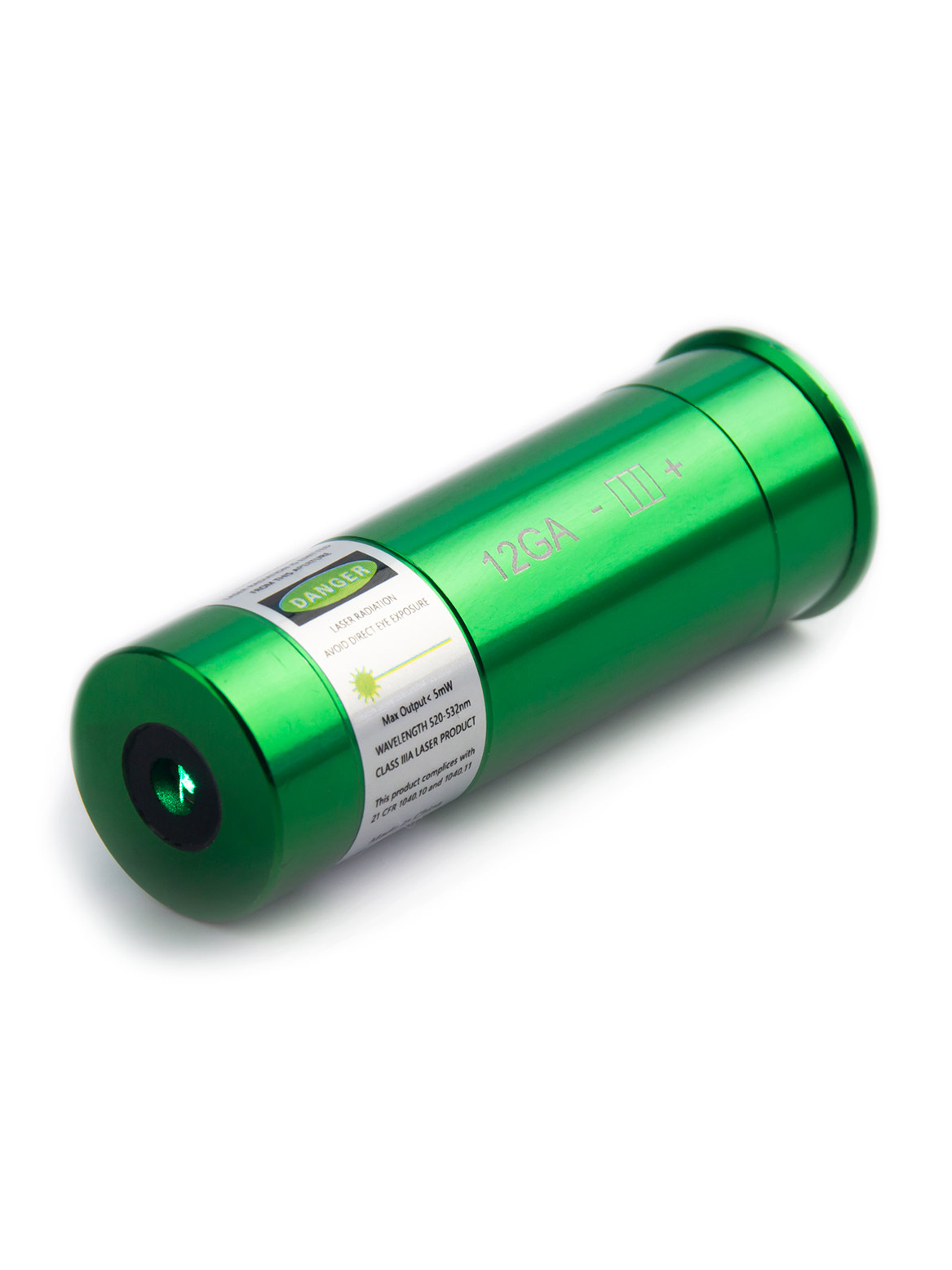 Лазерный патрон ColdShot 12х60 для холодной пристрелки. Отличается наличием резиновой кнопки включения/выключения лазера. Совместим с ружьями 12-ого калибра. Цвет лазера зеленый.