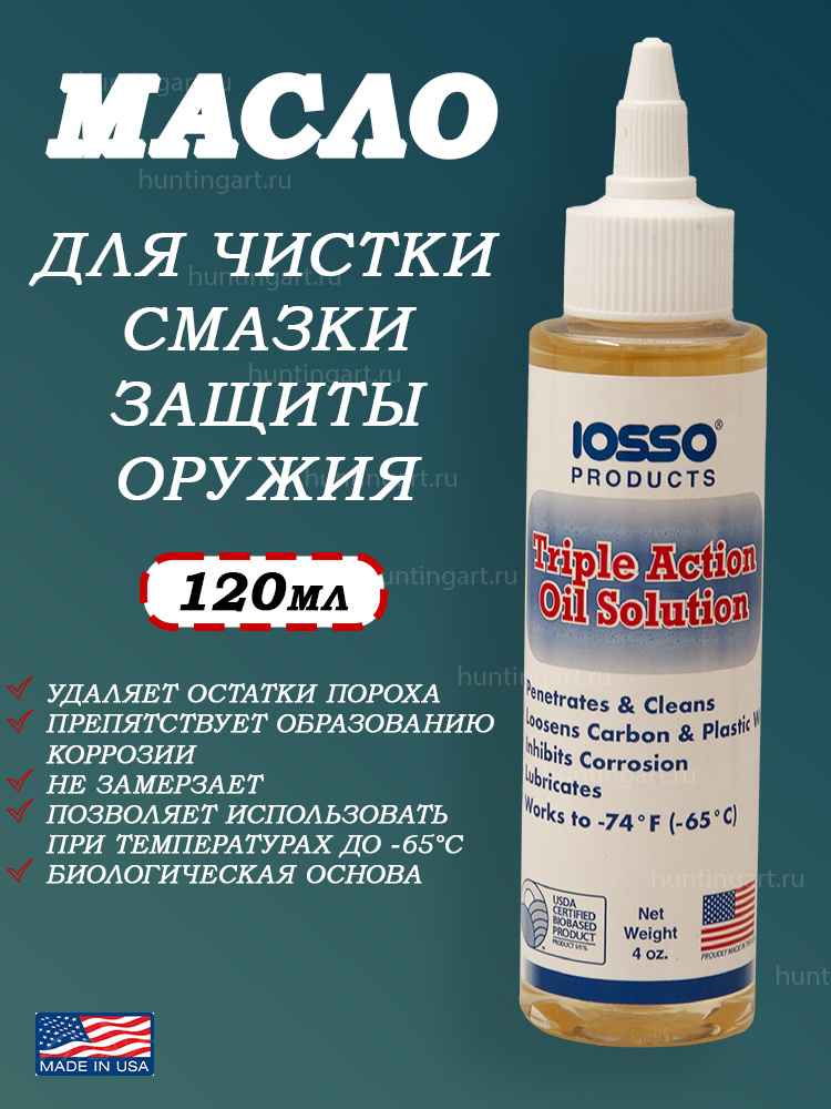 Масло 3в1 IOSSO Triple Action Solution – биоразлагаемый продукт из растительных экстрактов, не содержит нефтяных дистиллятов или аммиака, не замерзает и не рассеивается при жаркой погоде. Как смазка – эффективно работает даже при экстремально низких температурах, препятствует заклиниванию оружия до (-65°C). Обладает низкой воспламеняемостью и легким запахом.