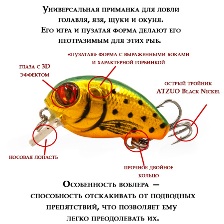 Воблер Nano Crank для современного рыбака. Обладает качествами классических приманок, а также инновационным дизайном (окрас и глаза с 3D эффектом). И вот эти самые колебания-игра , плюс его симпатичная «пузатая» форма с выраженными боками и с характерной горбинкой, делают воблер просто неотразимым для голавля, язя, щуки и окуня. Один из самых универсальных воблеров. Другая заявленная особенность данного воблера – способность отскакивать от подводных препятствий. Действительно, его носовая лопасть устроена таким образом, что после того, как воблер задевает за дно, камни или бревна, он не зарывается в препятствие, а запросто перепрыгивает его.