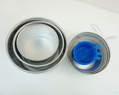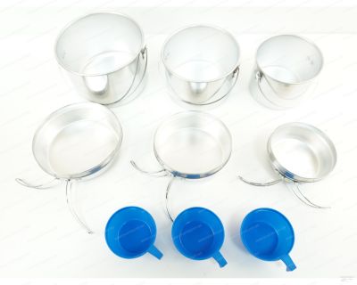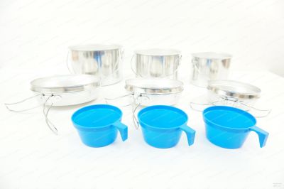 Набор посуды, состоящий из трех кастрюль, трех сковородок и трех кружек, компактно складывающихся друг в друга. Такой набор рассчитан на компанию от 3 и более человек. Вся посуда выполнена из легкого алюминия. Сковорода может использоваться в качестве удобной крышки. С набором посуды из 9 предметов вы приготовите прекрасные блюда, и порадуете себя и своих близких горячей и вкусной едой в походе, на пикнике и на даче.