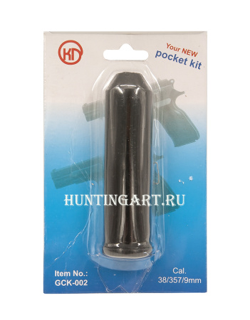 Набор для чистки пистолетов калибра 4,5 мм или 9мм поставляется пластиковом пенале-цилиндре в котором удобно умещается содержимое всего набора. Пенал-цилиндр так же выступает в роли рукоятки шомпола. Набор очень компактный и занимает минимум места.
