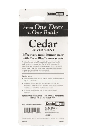 Иногда нужно пахнуть, как пахнет природа. Особенно, если вы собираетесь охотиться на трофейных животных. Осенью, когда еды меньше, желуди и кедровые шишки являются одним из наиболее важных источников пищи для многих животных. Это питательные продукты, которые олени будут активно искать и потреблять в больших количествах. Так что если вы охотились в районе с большим количеством деревьев дуба, или кедра нейтрализатор запаха Code Blue скроет ваш человеческий запах приятным ароматом желудей или кедровых орехов который будет вызывать любопытство у животных. Code Blue с ароматами жёлудя и кедра является идеальным дополнением к нейтрализаторам запаха обеспечивающим скрытность во время осеннего и зимнего охотничьего сезона. И несомненно, с естественным запахом желудей или кедра, вы будете соответствовать среде обитания животных на которых охотитесь. Даже если в ваших лесах нет этих деревьев эти запахи будут вас хорошо маскировать и вызывать любопытство многих животных. Также, вы можете воспользоваться запахом сосны, если не уверены, что другие запахи вам подходят.