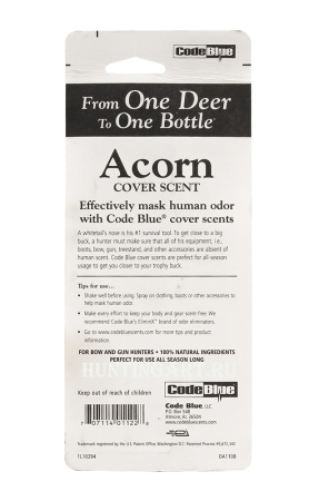 Иногда нужно пахнуть, как пахнет природа. Особенно, если вы собираетесь охотиться на трофейных животных. Осенью, когда еды меньше, желуди и кедровые шишки являются одним из наиболее важных источников пищи для многих животных. Это питательные продукты, которые олени будут активно искать и потреблять в больших количествах. Так что если вы охотились в районе с большим количеством деревьев дуба, или кедра нейтрализатор запаха Code Blue скроет ваш человеческий запах приятным ароматом желудей или кедровых орехов который будет вызывать любопытство у животных. Code Blue с ароматами жёлудя и кедра является идеальным дополнением к нейтрализаторам запаха обеспечивающим скрытность во время осеннего и зимнего охотничьего сезона. И несомненно, с естественным запахом желудей или кедра, вы будете соответствовать среде обитания животных на которых охотитесь. Даже если в ваших лесах нет этих деревьев эти запахи будут вас хорошо маскировать и вызывать любопытство многих животных. Также, вы можете воспользоваться запахом сосны, если не уверены, что другие запахи вам подходят.