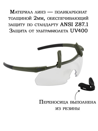 Стрелковые очки имеют переносицу из резины, что обеспечивает комфорт и удобство при ношении. Также они оснащены базовым антифогом и защитой от ультрафиолета UV 400, что гарантирует безопасность глаз при использовании. Очки из поликарбоната толщиной 2 мм обеспечивают защиту по стандарту ANSI Z87.1, что делает их идеальным выбором для стрельбы. Оправа выполнена из TR90 - гипоаллергенного, прочного и легкого полимера, который не бьется и отлично подходит для использования в экстремальных условиях.