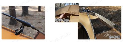 Преимущества быстро-сборной (автоматической) системы INSTA-SET® Для решения этой проблемы была разработана и запатентована Система Быстрой Установки INSTA-SET. Она представляет собой каркас, состоящий из узлов-шарниров, объединяющий дуги в единый механизм. Потянув за центральный хаб вверх, дуги самостоятельно разворачиваются и встают на свои места, остается только защелкнуть замки-шарниры. К каркасу (еще на стадии производства), с помощью специальных карманов, крепится палатка (и тент -если он есть). Таким образом, палатка устанавливается вся сразу без затрат времени на продевание дуг каркаса в карманы тента и на пристегивание внутренней палатки, это особенно полезно при установке палатки во время дождя, при этом внутренняя палатка всегда остается сухой. Каркас для палатки изготавливается из стеклопластиковых рубок 7,9 мм. Материал водонепроницаем, палатка выдерживает давление воды 3000 мм, обладает защитой от ультрафиолета, очень устойчива при ветре, удобна и функциональна. Не ломается, не падает, достойно выдерживает любую непогоду, в т. ч. сильный ветер. Время на сборку порядка 2-х минут.