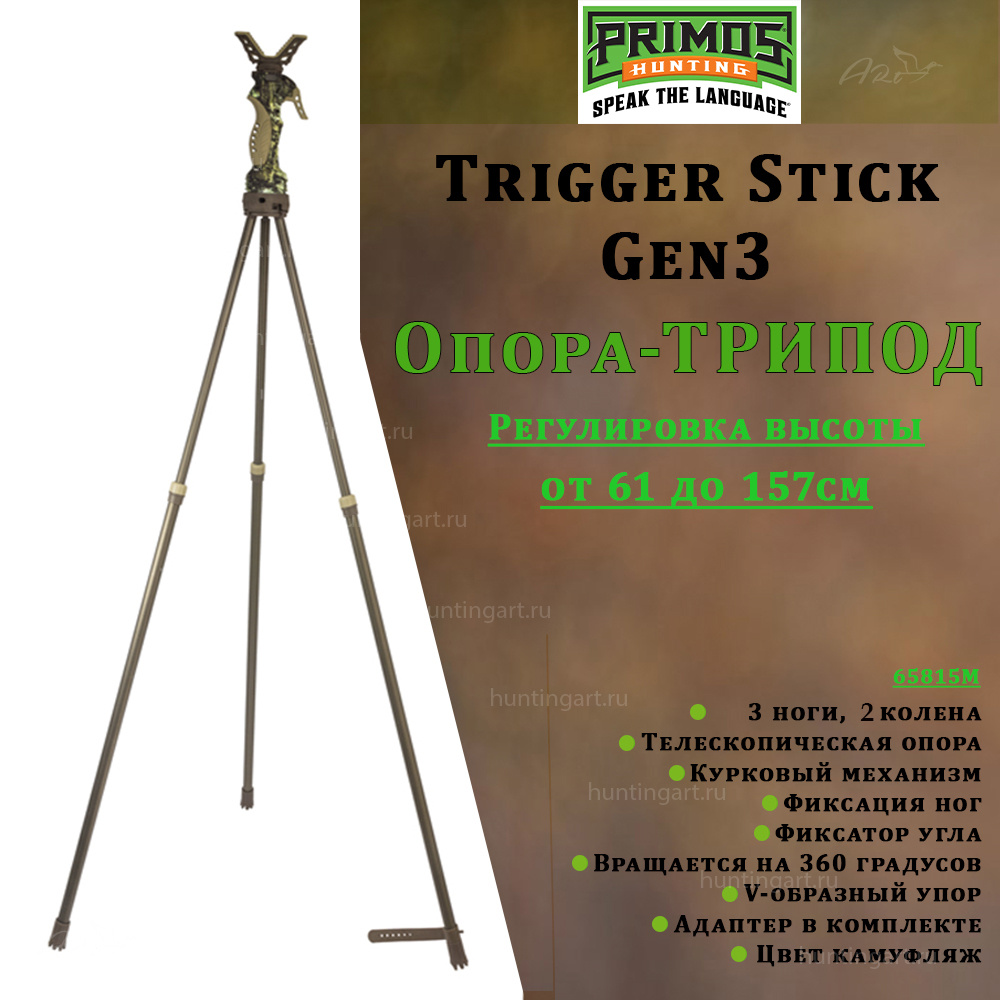 Тренога Trigger Stick gen3 имеет телескопическую конструкцию и состоит из 3 частей (колен). Одним из достоинств опоры третьего поколения, являются бесшумные телескопические ноги, с фиксатором угла раздвижения ног и углом наклона. Фиксация стала возможна благодаря усовершенствованию и новым технологиям модели. Фиксация ног в разложенном виде осуществляется с помощью так называемого «пистолетно-защелкивающегося» механизма. Для того чтобы разложить или сложить опору, достаточно лишь нажать на специальный курок и упирается ногами в землю. Для того чтобы привести треногу в удобное положение нужна всего одна секунда времени, а с вашей стороны лишь нажатие на спусковую скобу фиксатор. Больше никаких телодвижений и нагибаний с приседаниями, фиксированием колен и т.д. - вам нужно просто нажать на спуск. Тренога сама адаптируется под неровный рельеф поверхности - ямки или кочки. В третьем поколении Trigger Stick была усовершенствована рукоять. Теперь сама рукоять плавно вращается (поворачивается) на 360 градусов, что и дает возможность оперативно и точно менять направления стрельбы. Под рукоятью есть специальное кольцо с фиксацией угла раздвижения ног и углом наклона. Рукоять выполнена из прочного пластика, однако в местах соприкосновения с ладонью имеет рельефную поверхность, предотвращающую вероятность скольжения по ней и создающую дополнительный комфорт при эксплуатации даже при морозной погоде. Также рукоять оснащена V-образным упором (вилкой), на быстросъемном адаптере (адапрер поставляется в комплекте). Вилка снимается и устанавливается быстро и просто, одним нажатием на кнопку (при опущенном фиксирующим флажке). Прорезиненный колпачок у основания опор, не дает, проваливается ногам в рыхлую почву и не проскальзывать на твердом покрытии.