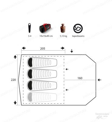 Палатка предназначена для 3-4 человек с большим и просторным тамбуром 160 см, в который можно войти с двух сторон. Использовать ее можно для кемпинга в течение весны, лета или осени.
