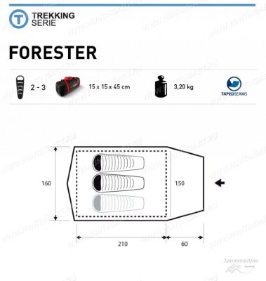 Палатка Trimm Forester предназначена для двух или трех туристов. Использовать ее можно в туристическом походе, в том числе и по Карпатам, на протяжении с весны до осени.