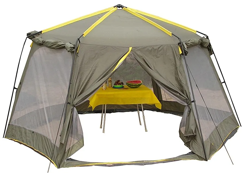 Удобная палатка-шатер для отдыха на природе. Прекрасно защищает от солнца и дождя! Антимоскитные сетки по всему периметру (6 граней) придадут необходимый комфорт вашему отдыху и надежно защитят от надоедливых комаров и гнуса. Отличительной особенностью данного шатра с москитными сетками является удобная защита от дождя и ветра при помощи удобных шторок, которые сворачиваются и крепятся на специальные застежки в верхней части "окна". Антимоскитный шатер имеет два входа, закрывающихся с помощью надежных молний, препятствующих доступу комаров внутрь. Каркас легко собирается и может быть установлен одним человеком всего за несколько минут. Шатер можно использовать как палатку для кемпинга.