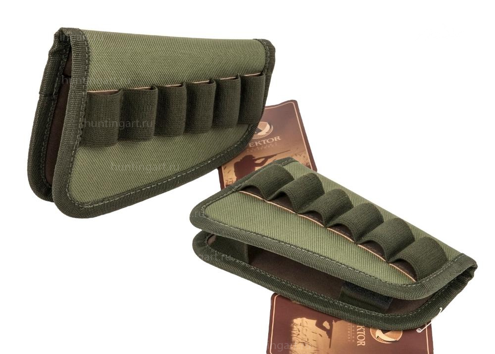 Одевается патронташ на приклад со стороны затыльника. Крепление на прикладе осуществляется за счет двух эластичных синтетических лент, расположенных в нижней части патронташа. Ближняя, к затыльнику, лента неразъёмная. Дальняя, от затыльника, лента для удобства монтажа патронташа на оружие разъемная. Выполнена с использованием застежки "Velkro" (липучка). Фиксация патронов в ячейках обеспечивается эластичной синтетической лентой и прорезиненной рельефной подложкой.