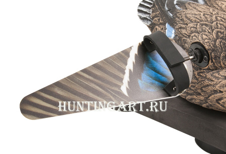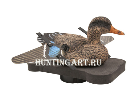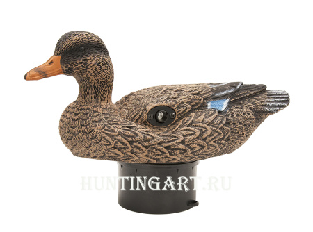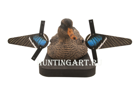 Чучело утки имеет крайне реалистичную степень окраски корпуса и выполнено из износостойкого EVA пластика ("ЭВА" - этилвинилацетат), который устойчив к трещинам. Крылья изготовлены при помощи инжекционной формовки, что обеспечивает их гибкость и прочность. На крылья нанесен фотореалистичный рисунок, а так же имеются специальные ремешки-брызговики, для создания брызг на воде. Крепятся крылья с помощью магнитного крепления, которое не только обеспечивает быструю установку, но и делает движения легче, что позволяет батарее работать дольше. Устанавливается приманка на прочную пенистую подушку/платформу, черного цвета, для устойчивого нахождения приманки на воде.