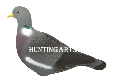 Чучела реалистичные, с рифленой поверхностью и детальной прорисовкой пера. Качественная многоцветная покраска матовой не бликующей краской. Корпуса голубя выполнены в форме "скорлупки" и за счет этого могут складываться один в другой тем самым уменьшая общий объем чучалок. В сложенном виде занимают очень мало места и удобны для хранения и транспортировки к месту охоты. Важно помнить, что при охоте на голубя важно количество выставленных муляжей вяхира, так как голуби осенью собираются в огромные стаи, которые кормятся на полях. Чтобы привлечь внимание этих стай - необходимо выставить как можно большее количество чучел, которые будут заметны на расстоянии.