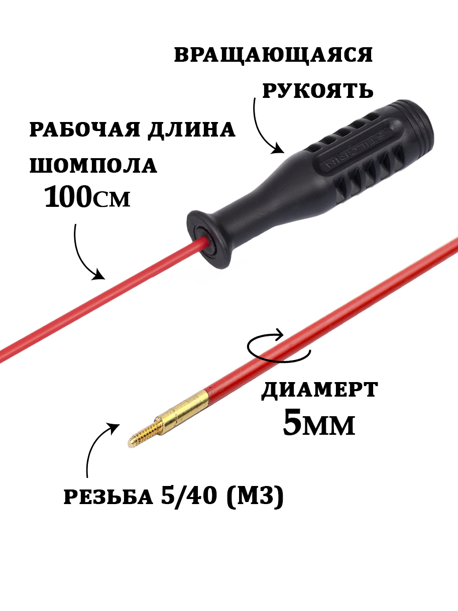 Односекционный шомпол диаметром 5мм применяется для чистки канала ствола после стрельбы. Также это приспособление поможет смазать внутреннюю поверхность ствола после чистки и удалить ржавчину или налет освинцовки, которые часто появляется на металлических поверхностях. Выполнен из цельного куска стали, сверху покрыт оплеткой ПВХ красного цвета.