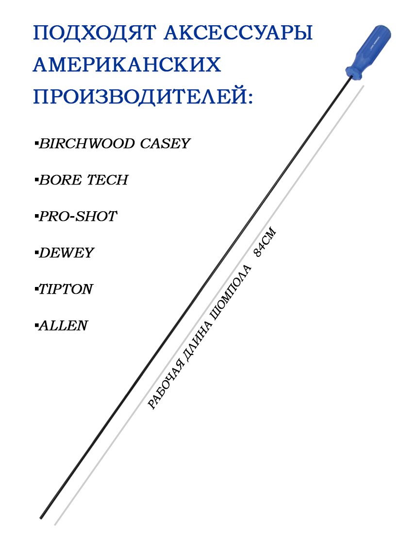 Шомпол покрыт слоем синтетики со свободно плавающей ручкой. Упакован в прозрачный тубус. Без переходника подходят аксессуары американских производителей Birchwood Casey, Bore Tech, Pro-Shot, Dewey, Tipton, Allen.