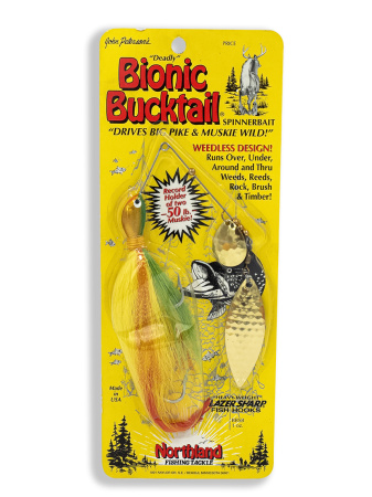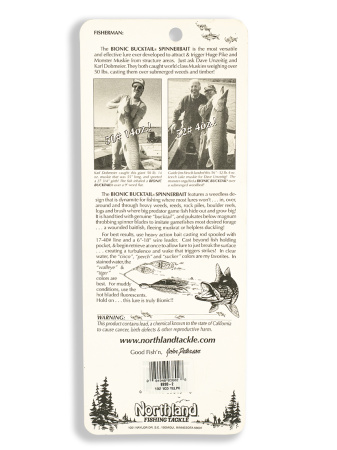 BIONIC BUCKTAIL® SPINNERBAIT - жабо из меха с хвоста белохвостого оленя, окрашенного в разные цвета, петушиного пера и люрекса. Бактейл — подвижный материал, сохраняет форму и объём во время быстрой проводки. Перо с седла петуха даёт дополнительное, волнообразное движение. Люрекс даёт мерцающий блеск. Дизайн головы в форме «корпуса лодки» (deep-V) для прямой проводки и удаления растительности Приманки оснащена двумя крюками VMC 7/0. Один жёстко соединён с головой приманки, второй свободно подвешен на цевье первого и закреплён от соскакивания. Такая конструкция способна "зацепить" даже самую осторожную рыбу, которая только "щиплет" приманку за хвост.