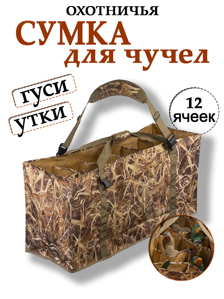 Сумка предназначена для удобства переноски и хранения гусиных и утиных чучалок, для их защиты от механических повреждений, появления царапин, стирания краски. Для каждого чучела имеется свое отдельное место, 12 равных секций (отделений). Длина сумки 107 см. Размер ячейки 17х18х41см. На внешней стороне есть большой карман. Имеется плечевой ремень отстегивается и оснащен быстросъемным фастексом, регулируются по длине.