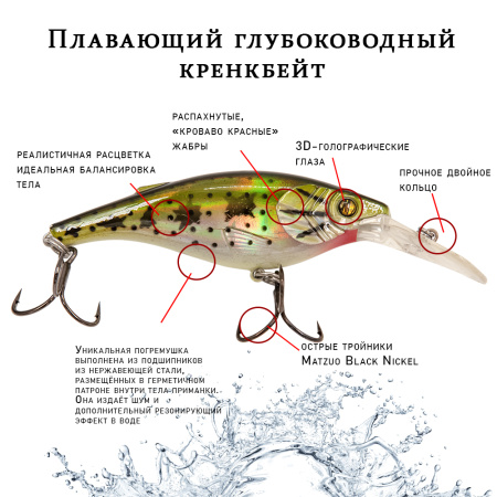 Плавающий глубоководный кренкбейт. Предназначен как для троллинга, так и для ловли взаброс. Погремушка с шариками из нержавеющей стали. Воблеры оснащаются тройниками MATZUO с покрытием Black Nickel.