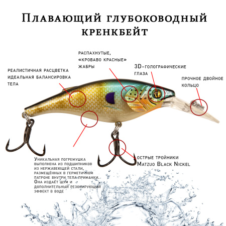 Плавающий глубоководный кренкбейт. Предназначен как для троллинга, так и для ловли взаброс. Погремушка с шариками из нержавеющей стали. Воблеры оснащаются тройниками MATZUO с покрытием Black Nickel.