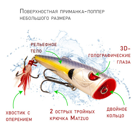 Поверхностная приманка-поппер небольшого размера. Воблеры оснащаются тройниками MATZUO собственного производства.