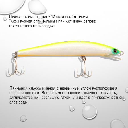 Оригинальная приманка для твичинкга от Японской компании Halcyon System. При рывках идёт в очень широком коридоре, не характерном для приманок такого размера. Подходит для облавливания обширных мелководий как с лодки так и сберега. Очень далеко и точно забрасывается.
