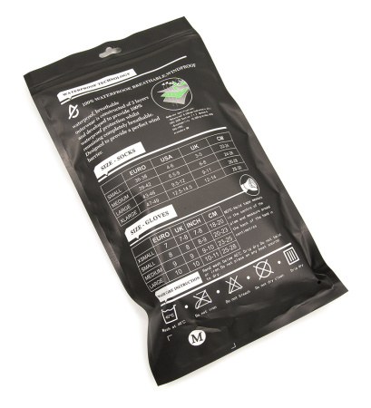 Средний слой, это тонкая паропроницаемая мембрана, не пропускающая воду, даже если нога будет полностью в воде. Она нуждается в защите от проколов. Носки нельзя носить на улице без обуви во избежание её проколов.
